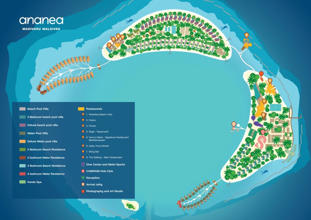 Ananea Madivaru Maldives is in a private lagoon in the North Ari Atoll and blends contemporary elegance with South Asian and Indian Ocean heritage. It is unique in that it is a twin-island resort with each connected by an overwater walkway and is a short sea plane transfer from Male. There are pristine white sandy beaches, a central lagoon, and a house reef rich in marine life, ideal for diving. There are 8-9 diverse dining venues, an overwater spa and most importantly beach villas so you can have that feet in the sand experience.